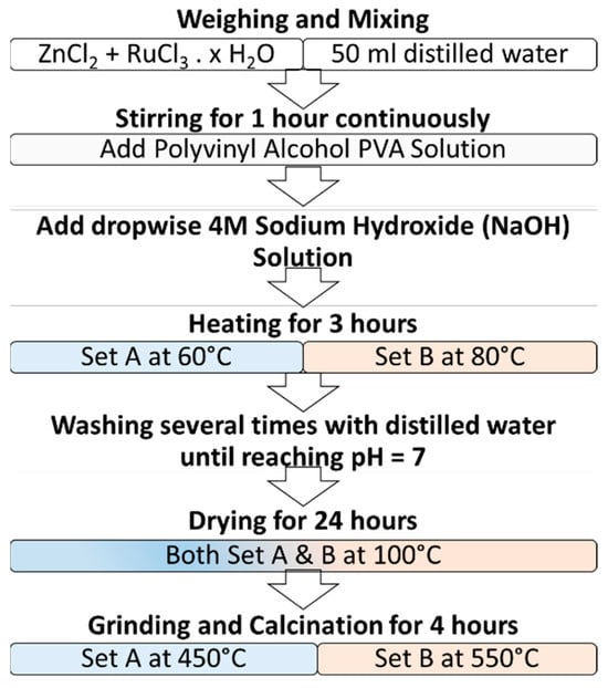 A co-precipitation method was used to synthesize pure ZnO and Ru-doped ZnO nanoparticles with the general formula Zn1−xRuxO, where x = 0.00, 0.01, 0.02, or 0.04, as summarized in the scheme of Figure 13. Solutions of 1 M zinc chloride (ZnCl2 ≥ 98%, Sigma Aldrich) and 1 M ruthenium (III) chloride (RuCl3.xH2O ≥ 99.9%, Alfa Aesar) were prepared in 50 mL of distilled water. Both solutions were mixed with different Ru contents with continuous stirring. To avoid agglomeration, polyvinyl alcohol (PVA) solution was added to dilute the solutions; the PVA solution was prepared by dissolving 4 g of PVA in 1 L of distilled water under continuous stirring at 80 °C for 30 min. Then, 4 M sodium hydroxide solution (NaOH) was added dropwise under continuous stirring to reach pH = 13. The resultant basic solutions were divided into sets A and B for a heating process as follows: set A was heated at 60 °C, and set B at 80 °C. To remove the impurities and neutralize both solutions, the acquired grey precipitate was then washed repeatedly until the pH reached 7. Lastly, set A was dried at 100 °C, ground, and calcinated at 450 °C, whereas set B was dried at 100 °C, ground, and calcinated at 550 °C.