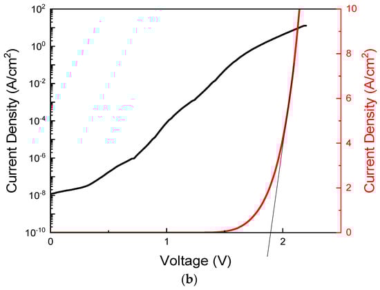 The I–V curves of the p+-NiO/n-Ga2O3 heterojunction, presented in Figure 2a,b, were measured using a Keithley 2400 Source Meter. The measurements were carried out at room temperature. The same instrument was employed to drive a forward current of 100 μA through the structure in Figure 1 for the total duration of 900 s, corresponding to the maximum charge of 90 mC. The forward current resulted in hole injection from p-niO to n-Ga2O3 layers and led to the results presented in the following section of this paper.