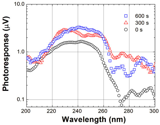 The photoresponse from the structure in Figure 1 is presented in Figure 4 as a function of forward bias duration. All spectra exhibit shoulders at about 255 nm, corresponding to the direct band-to-band transition in β-gallium oxide [1,2,3,34]. The maxima for all spectra are observed between 230 and 240 nm and likely correspond to the excitonic absorption. These maxima (peaks), taken at the corresponding wavelength within the above-referenced range, are used in the future analysis. Similar photoresponse peaks were recently observed between 5.0 and 5.2 eV (238–248 nm wavelength range) in ref. [35], consistent with the band structure of the monoclinic Ga2O3 [34].