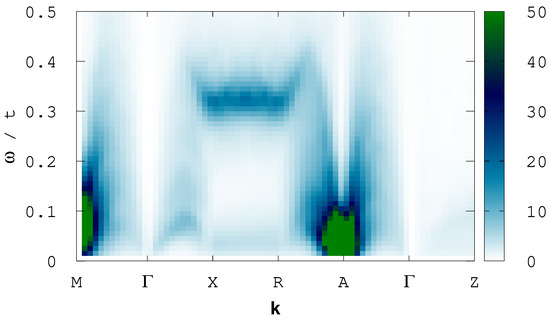 The magnetic excitation spectrum obtained in the low-temperature AFM phase of the one-band and two-band models are shown in Figure 3 and Figure 4, respectively. We see the magnetic Bragg peak emerge at and . At and , the high intensity reflects the competing—but loosing—ordering tendency. In addition to these peaks, we find low-energy magnon-like modes with an in-plane dispersion in both models, see Figure 3 and Figure 4. These magnon-like modes are damped, which is likely due to hole doping of the correlated d band. Similar models were also observed in experiments at energies [31,32]. There is, thus, good agreement between the experiment and the present one-band model and qualitative agreement with the two-band model.