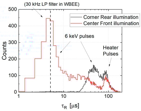 Rise time constant distribution of the acquired pulses in the two different illumination points. In the “Center Front illumination”, the electronics LP filter limits the value at ~5 μs.