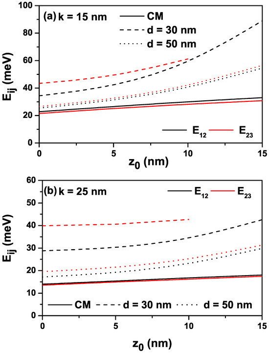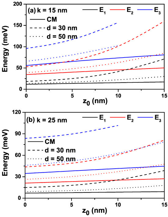 The variations in the energies corresponding to the first three levels of a confined electron within the IRMQW as a function of the -parameter in the absence and presence of position dependence mass for the nm and nm values are given in Figure 2a,b. In the absence and presence of PDM, energies are an increasing function of the -parameter. As explained above, the energies increase since the increase in the -parameter causes an increase in the geometric confinement. As seen in Equation (2), for small values of the d-parameter, the PDM of the electron is lower than that of the constant mass (CM), i.e., . So, the energy values of the electron become larger since the energy levels are always inversely proportional to the electron’s effective mass. However, for larger values of the d-parameter, the energy values of the electron also approach the CM results since approaches the -value. Furthermore, the electron that has -energy becomes unbound at nm due to the increase in energies following the combined effects of the PDM and -parameter. The increase in the k-width parameter weakens the geometric confinement. Therefore, the energies decrease, and the electron with -energy becomes bound in the well at the same value for a large d.