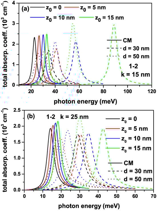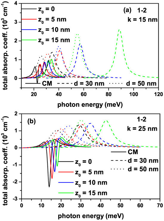 Figure 4a,b show the variation in total absorption coefficients for a transition that is called the (1-2) between the ground and first excited states of an electron confined within the quantum well with the improved Rosen–Morse confinement potential as a function of the incident photon energy for different -values for nm and nm, respectively.