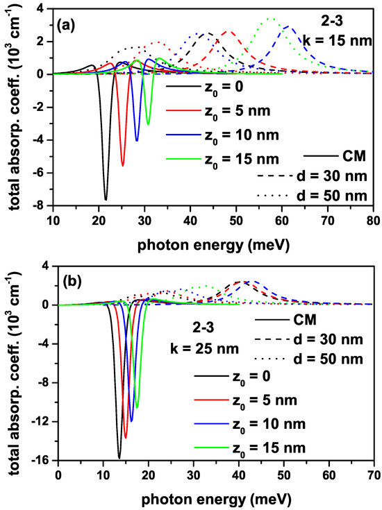 Figure 5a,b have the same regulations as in Figure 4a,b, but the results given are for the (2-3) transition. It should be noted that the incident photon intensity for all the transitions in Figure 4 and Figure 5 is W/m2. The bleaching effect is quite pronounced in the total absorption peaks corresponding to the (2-3) transition since the nonlinear term is greater than the linear term, and absorption peaks localize in lower photon energies than the (1-2) transition. Furthermore, the total absorption peaks for the (2-3) transition are not observed since the electron with the -energy is unbound within the IRMQW for nm.