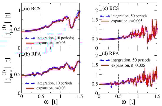 Magnitude of the first harmonic response for BCS (a,c) and RPA (b,d). The paramagnetic current obtained from the direct time integration Equation (6) is shown by the blue dotted line, and integration was performed over 10 (a,b) and 50 (c,d) periods of the applied vector potential. The current evaluated from the expansion Equations (17) and (25) is shown in red. Here, we used (a,b) and (c,d) in order to shift the energy into the complex plane, . The vertical dashed line marks the optical gap . Further parameters: lattice with 56 electrons. ; .