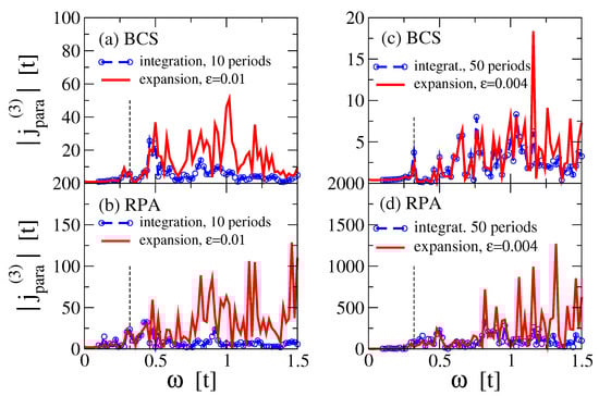 For the same disorder configuration as was used for Figure 1 and Figure 2, we show in Figure 3 the third harmonic response from Equations (17) and (25) as compared to the direct time integration of Equation (6). Consistent with our previous results [], the strongly disordered ordered sample displays a low paramagnetic energy response at , both in the BCS and RPA, where the latter is enhanced by the contribution from the collective modes. As in case of the diamagnetic contribution (cf. Figure 2), the “expansion result” (red) for a fixed parameter can be adjusted to the time-integrated spectrum (blue dotted line) at low energies, but with a decreasing number of periods in the time integration, the agreement in intensity is lost at higher energies. This is particularly visible in Figure 3d, where the contribution from band excitations leads to significantly larger intensities for the small as compared to the time integration over 50 periods of the applied vector potential.