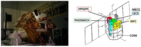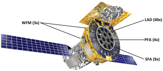 The BeppoSax technological breakthrough [10] was the wide energy spectrum (0.1–300.0 keV) detectable by its instrument (see Figure 1), never obtained in previous missions. In addition to the extraordinary energy amplitude, the satellite allowed the observation of transient phenomena due to Wide Field Cameras [11] (WFCs) and Gamma Ray Burst Monitors [12] (GRBMs) coupled with the narrow field-high energy resolution instruments. Moreover, its flexible operational capabilities allowed relatively fast implementation for its epoch and targets of opportunities. The payload consists of Narrow Field Instruments (NFIs, aligned and with a spectral range of 0.1–300.0 keV); Wide Field Instruments (WFIs, orthogonal to the NFI and oppositely oriented, offering coverage between 2.0 and 30.0 keV) and the GRBMs, partial NFIs shield, to trigger for gamma rays due to the temporal resolution of 1 ms and spectral coverage within 60–600 keV.