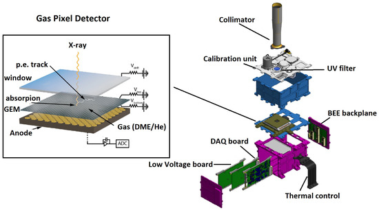 - Soffitta, P.; Baldini, L.; Bellazzini, R.; Costa, E.; Latronico, L.; Muleri, F.; Del Monte, E.; Fabiani, S.; Minuti, M.; Pinchera, M.; et al. The Instrument of the Imaging X-ray Polarimetry Explorer. Astron. J. 2021, 162, 208. [Google Scholar] [CrossRef]