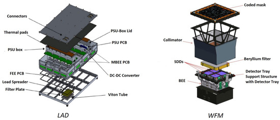 - Large area detector (LAD): photon-by-photon spectral and timing measurements on a large collecting area in the energy range of 2–30 keV (80 keV for out-of-field-of-view burst events) with FoV of about 1° due to the collimator needed for an X-ray background. Each module consists of a set of a 4 × 4 large area SDDs and 4 × 4 capillary plate collimators, supported by two grid-like frame reduction. Overall, each module consists of a collimator (16 co-aligned collimator plate tiles), the detector tray (16 SDDs and the FEEs), the MBEE (Module Back-End Electronic) (two sectors, eight detectors each for SDDs, FEEs, PSUs, management and readout), the PSU, a 300 m Lead back-shield to reduce the background events in the SDDs, and a 2 mm aluminum radiator for heat dissipation.