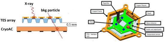 The X-IFU TES array main sensor is not able to distinguish among photon and particle energy deposition (see Figure 8); thus, it is necessary to adopt a Cryogenic AntiCoincidence detector (CryoAC) [53,54] to veto particle background (primary solar and Galactic Cosmic Ray origin and secondary, mostly electrons, produced by primaries interacting with the materials surrounding the detector) to prevent X-IFU sensitivity degradation: it is worth noting that the required Non-X-ray Background level is <0.005 cts/cm2/s/keV in a 2–10 keV energy bandwidth.