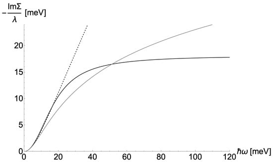 Notice that the limit leads to a quadratic dependence in , which is in agreement with a standard Fermi liquid behavior. Due to the constant or weakly divergent behavior at high frequencies, never displays a truly linear-in- behavior, characteristic, e.g., of the MFL state; rather, it switches from a quadratic to a logarithmic or constant regime so that an approximately linear dependence in the crossover region of the inflection point occurs between the two regimes. However, the linear regime is quite extended, and for the parameters used in Figure 3, it comprises an energy interval of ∼15 meV around the inflection point where the relative difference between exact and linearized is below . One can also notice that the slope of the approximately linear regime of this function does not depend on . This regime is clearly visible around the inflection point of , which occurs around a frequency