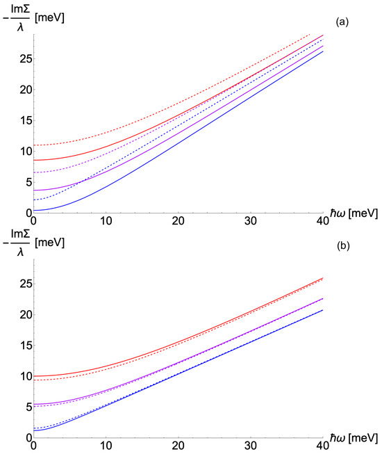 Solid lines: Frequency dependence at various temperatures ( meV (blue curves), meV (magenta curves) and meV (red curves)) of the approximate Equation (A2) in comparison with the MFL expression (dotted lines) at the same temperatures. The values of the parameters are meV, in (a); in (b); meV.