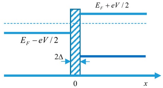 Initially, the particles on the left reservoir occupy all states within the range , and on the right one, they occupy all states whose energy is within the range (see Figure 1). It is taken that the temperature is close to zero.