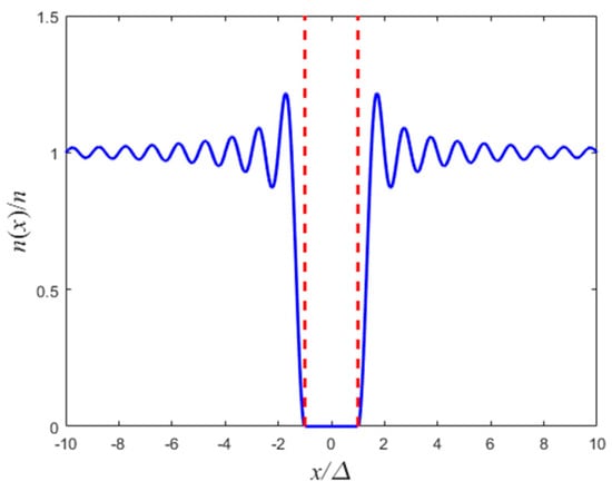 The particles’ density as a function of the spatial coordinate x. The vertical dashed lines represent the shutter’s position.