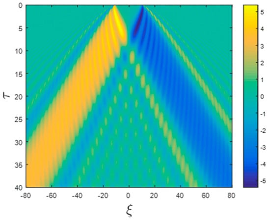 A false-color presentation of the spatiotemporal structure of the dimensionless current; however, unlike Figure 2, initially both states and exist. In this example, it was taken that .