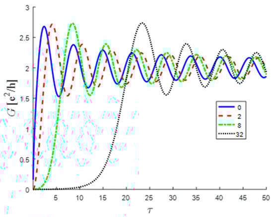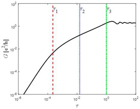 In the very short-time regime, i.e., (), the conductance agrees with Equation (19); however, between the time scales, () , i.e.,