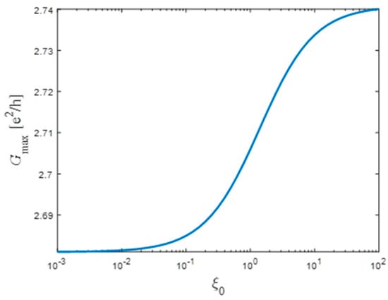 Since the first maximum is reached approximately at , then the two extreme values can be evaluated by substituting this value into the conductance formula for the two limiting regimes ( and ). The lower value can be evaluated by the following: