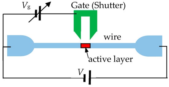 The tunable shutter can be realized as a point of contact with side branches as controls (see, for example, Ref. [] and references therein). A schematic illustration of such a system is depicted in Figure 8. The narrow wire is connected to the active layer, which emits light, and to the voltage source. The gate controls the current from the wire to the active layer, which emits light. The detected light power is proportional to the current through the active layer. If the wire is made of semiconductors, then the Fermi energy is of the order of meV []. Therefore, to prevent multi-mode propagation in the wire, the wire’s width should be around 10–100 nm, where the Fermi energy of the semiconductor is close to the wire’s cutoff energy.