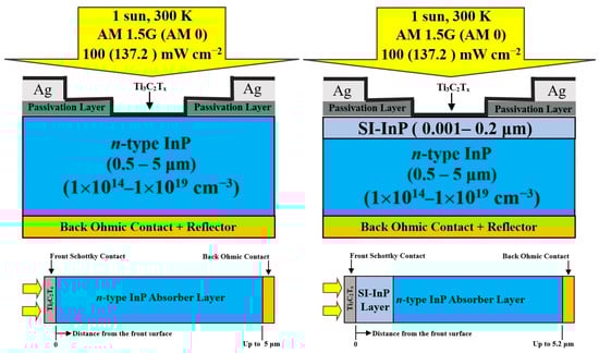 The Ti3C2Tx work function can be tuned theoretically from ~1.6 eV to ~6.7 eV []. However, Si-based and GaAs-based Schottky solar cell experiments have shown work functions ranging from ~5 eV to ~5.5 eV [,]. Hence, this range, which corresponds to an expected built-in potential barrier (qVbi) range from ~0.40 eV to ~1.20 eV (ND = 1 × 1014 − 1 × 1019 cm−3), was considered for optimizing the MS cell. For the MIS cell, the same range is used; nonetheless, this range does not necessarily correspond to the same metal work function range as in the MS structure since the metal in the MIS structure comes into intimate contact with the highly resistive SI-InP interlayer, as opposed to the n-InP layer, with a much lower, nonvarying carrier concentration (~1.2 × 108 cm−3). The optimization for both cells also involved varying the n-InP layer doping concentration (ND) from 1 × 1014 to 1 × 1019 cm−3 and the n-InP layer thickness from 0.5 to 5 μm while keeping the remaining parameters fixed, as specified in Table 2. The SI-InP layer’s thickness was varied from 0.001 to 0.2 μm for the MIS solar cell structure. Table 3 presents the optimized parameters for both structures, assuming a 300 K ambient temperature under the AM 1.5G and AM 0 spectra.