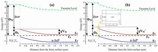 To confirm the formation of a Schottky junction between the n-InP absorber layer and the Ti3C2Tx TCE, initial simulations were conducted under equilibrium conditions for the solar cell structures depicted in Figure 2, using the parameters listed in Table 2. The simulation results were used to assess the energy band diagrams and junction electrostatics. For the MS structure, an assumption was made that Φm = 5.50 eV and ND = 1 × 1015 cm−3. Based on this, the value of qVbi was determined to be ~0.956 eV, which was used as the front surface barrier value in the initial simulation (Table 2). The simulation shows that a Schottky barrier height Φb of ~1.12 eV is formed, as illustrated by the energy band diagram for the MS structure in Figure 3a. It should be noted that this figure depicts the region of the n-InP layer where band bending takes place, which is within the first two micrometers from the MS junction.