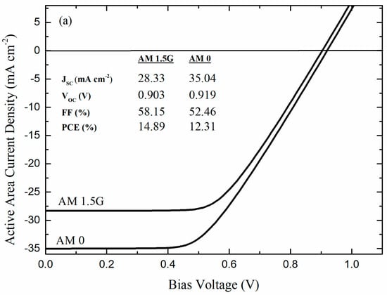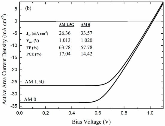 The J-V characteristics simulated under AM 1.5G and AM 0 solar spectra for MS and MIS Schottky structures, along with performance data, are shown in Figure 4. Both structures performed better under AM 1.5G compared to AM 0, which agrees with previous investigations on the performance of InP-based solar cells under both spectra [,]. The introduction of SI-InP enhanced the open circuit voltage (VOC) under AM 1.5G; however, it has led to lower short circuit current densities (Jsc) in the MIS structure. Despite this, the MIS structure has a higher fill factor (FF) and PCE under both spectra than the MS structure.