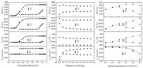 Since this work is primarily concerned with designing low-cost InP-based Schottky solar cells for terrestrial applications, the simulation results shown in Figure 5 assume only the AM 1.5G spectrum to illustrate the performance sensitivity of the optimized MS and MIS structures to changes in the optimized parameters listed in Table 3.