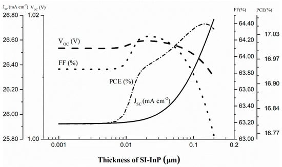 A specific threshold front surface barrier value exists for both structures, where the photovoltaic action diminishes due to the absence of (or very low) Φb for a given doping concentration. This corresponds to a metal with a work function comparable to or lower than an n-type semiconductor. According to the ideal MS junction’s theory, this leads to the formation of an ohmic contact rather than a Schottky contact to the n-type semiconductor. The threshold qVbi values are ~0.55 eV and ~0.1 eV for the MS and MIS structures. As displayed in Figure 5a, the performance of the MS structure is almost unchanged for qVbi < ~0.90 eV, and afterward, the PCE and FF increase to their maximum values (14.89% and 58.15%), due to the improvement in VOC. In the MIS structure, improvement in PCE and FF happens earlier, at qVbi of ~0.45 eV. As of the influence of the n-InP absorber thickness (Figure 5b), the PCE of the MS structure noticeably increases at thicknesses <~2 μm and keeps increasing very slightly afterward, but it starts to decrease beyond 15 μm (outside the range shown). For the MIS structure, the improvement in PCE due to JSC occurs in the n-InP thickness range of 0.5–1 μm, slightly decreases until 3 μm, and then remains constant until 15 μm, after which it decreases slightly (outside the range shown). Figure 5c depicts the influence of n-InP absorber doping concentration (ND) on both structures, where JSC starts to decrease at ND > 1 × 1016 cm−3. However, this decrease is offset by a continuous increase in VOC along the whole range of ND in the MIS structure. The situation is different for the MS structure, since VOC starts decreasing at ND > 1 × 1016 cm−3, which causes the PCE to reach its maximum earlier than the MIS structure. Figure 6 shows the influence of SI-InP layer thickness on the MIS structure’s performance. The increase in JSC for thicknesses >0.01 μm is negated by the decrease in VOC and the FF, leading to a delayed decrease in PCE after 0.1 μm.