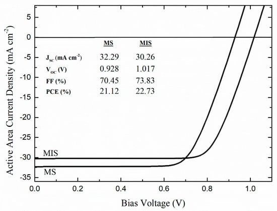 Based on the data presented in Figure 7, it is evident that the front contact series resistance and exterior front reflectance significantly impact the PCE of both cell structures. On the other hand, the front surface recombination velocities (SRVs) have a negligible effect on the PCE of the MIS structure, unlike the MS structure. However, the effect of this parameter is minor when compared to the impact of front contact series resistance and exterior front reflectance. The front contact’s series resistance value could be improved experimentally, but 5 Ω was chosen as a realistic minimum value for now to avoid performance overestimation (Figure 7a), as mature solar cell technologies typically have area-normalized series resistance values that are much less than 5 Ωcm2 []. The J-V characteristics, simulated under the AM 1.5G solar spectrum for the MS and MIS structures after considering the improved potential gain parameters, are shown in Figure 8, along with performance data. Assuming a front contact series resistance of 5 ohms, a front surface reflectance of 5%, and front SRVs of 200 cm s−1, these favorable figures are achieved by using the optimum parameter values, as listed in Table 3. All other parameters are fixed, as specified in Table 2.