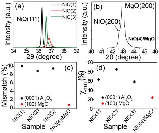 XRD diffraction patterns of (a) (111) NiO films grown on (0001) AlO substrate and (b) (100) NiO film grown on (100) MgO substrate. (c) Lattice mismatch with the substrate and (d) minimum yield ratio obtained from the channeling and random RBS spectra for the NiO films grown on the (0001) AlO and (100) MgO substrates.