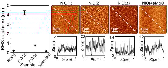 Atomic force microscopy measurements were carried out on different virgin NiO films (see Figure 2) using an instrument from Nanotec Electronica S.L. controlled with the WSxM software (version 5.0) [42]. Both typical images and root-mean-square (RMS) roughness analysis were in general agreement with XRD and RBS characterization, pointing toward the most flat surface in NiO(4)/MgO and the greatest roughness in NiO(2) film.