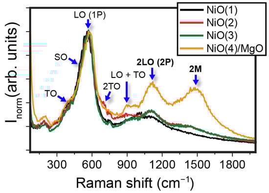 Resolved Raman modes for all the analyzed NiO films in the virgin state. The active modes are in agreement with those of previous reports [43,44], indicating the good quality of the films. The 2LO (2P) and 2M modes were especially visible in the NiO(4)/MgO sample. The Raman spectra are normalized to the LO mode (1P).
