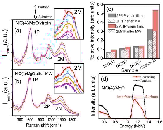 Resolved Raman spectra in the in-depth direction (XZ plane) for the NiO(4)/MgO sample (a) in its virgin state and (b) immediately after being put through a maintained microwave drive of 5 dBm. The normalization of the intensity signal was completed by adjusting the 1P band. The assignation of the 1P, 2P, and 2M active modes is marked on the figure. Raman spectra correspond to equidistant points in the depth profile of the film from the film surface (1) to the substrate interface (5). This analysis shows extraordinary variation of the 2P and 2M modes in the depth coordinate. (c) Relative intensity of 2P/1P and 2M/1P on the virgin films and after the application of MW. There was a correlation between the reduction of the intensity of the 2P and 2M modes and the application of MW for all of the analyzed samples. The NiO(4)/MgO sample was particularly sensitive to the effect of the MW, partially since the 2P and 2M modes were highly manifest. (d) Channeling and random RBS spectra of the NiO(4)/MgO sample.