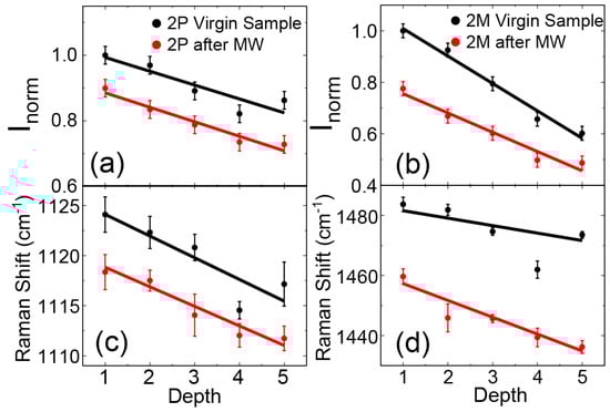 Behavior of the 2P (a,c) and 2M (b,d) Raman modes in the NiO(4)/MgO sample against the depth of the analysis before and after a continuous application of a MW field. (a,b) Intensity of the modes normalized by the maximum value before the MW pumping. (c,d) Raman shift of the modes’ peaks.