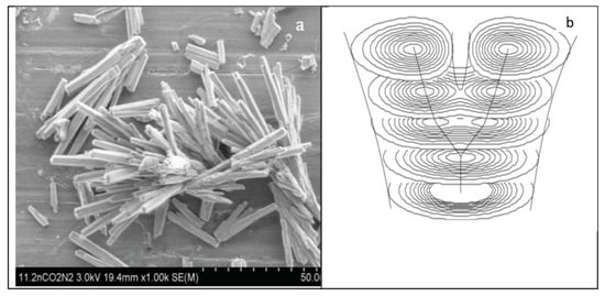 (a) A Schrödinger flower reproduced from [16]. (b) An inorganic flower grown from a BaCO3-SiO2 solution reproduced from [4].