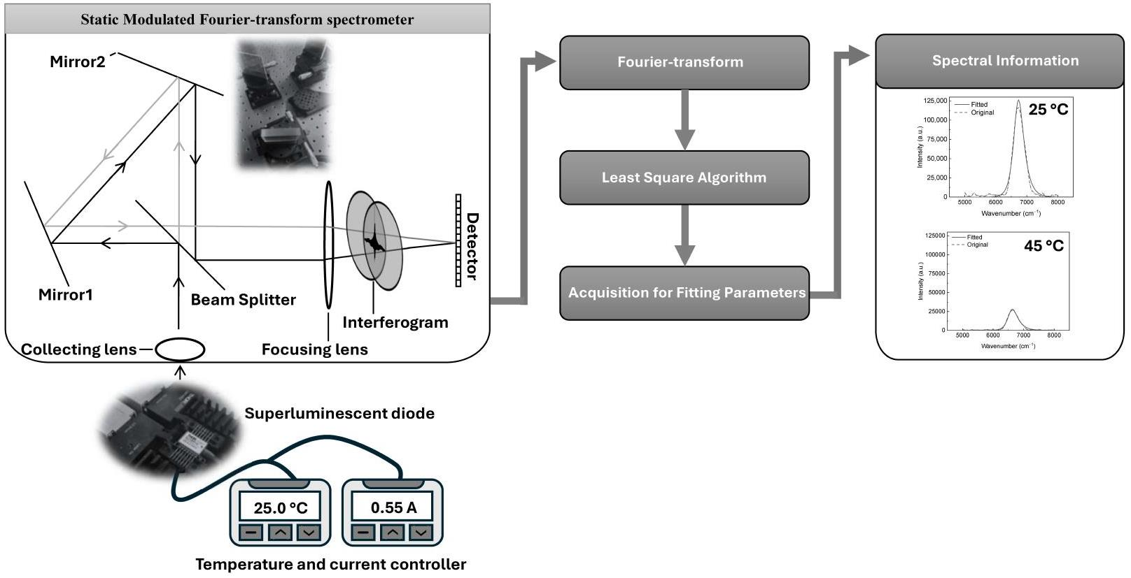 To address this limitation, the static modulated Fourier-transform spectrometer is employed. Unlike traditional scanning instruments, the static modulated Fourier-transform spectrometer generates an interferogram as a function of space, making it ideally suited for the real-time, instantaneous monitoring of the optical properties of light sources.