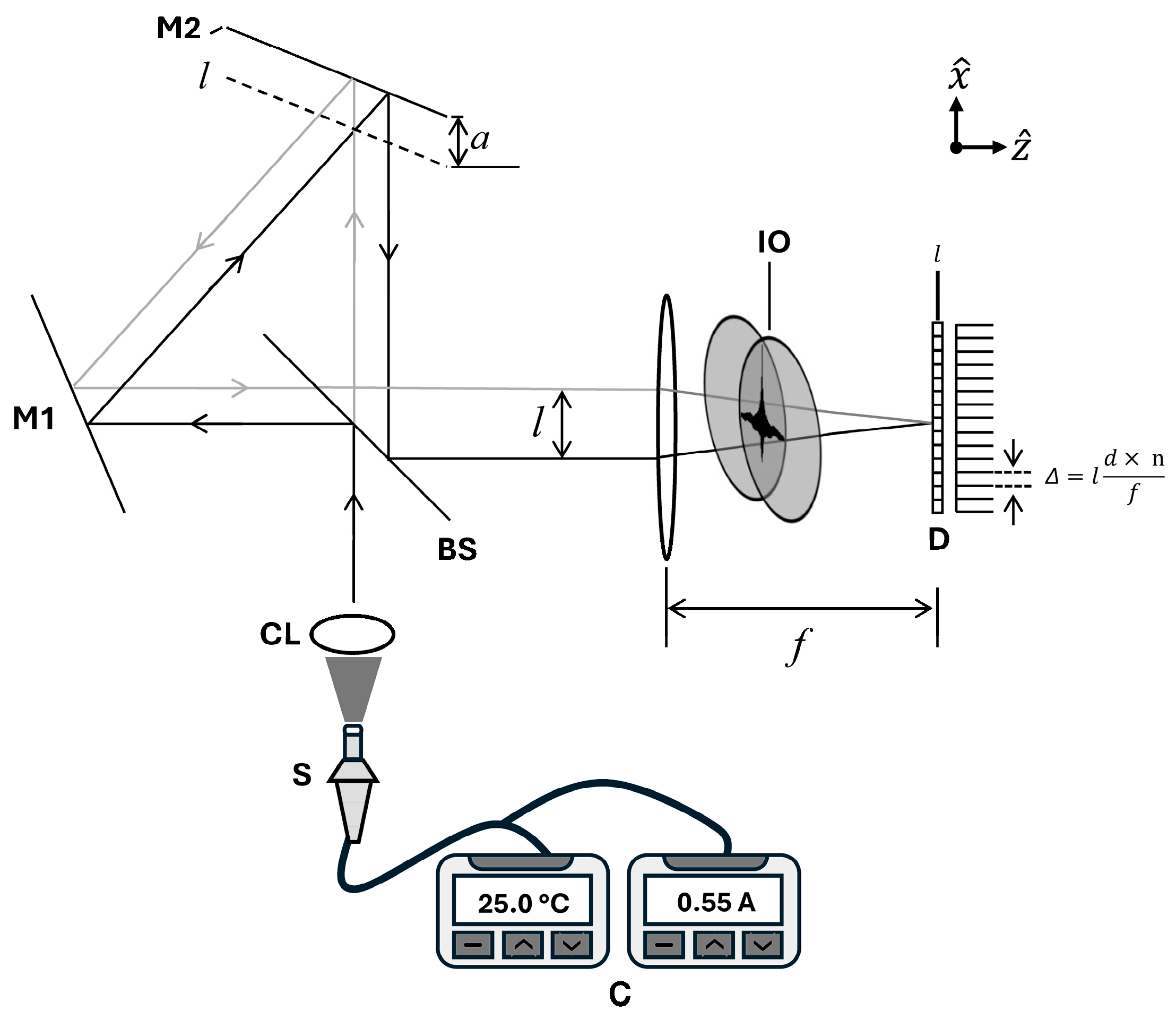 Figure 1. Emission from the optical source is collected and collimated by the collective optics. The collected light enters the static modulated Fourier-transform spectrometer. It is split into two separate beams at the beam splitter. Since two mirrors are asymmetrically displaced from the beamsplitter, the separated beams travel different optical paths. The two beams are subsequently recombined at the beamsplitter. This optical path difference causes the beams to interfere, generating a spatially distributed interferogram.