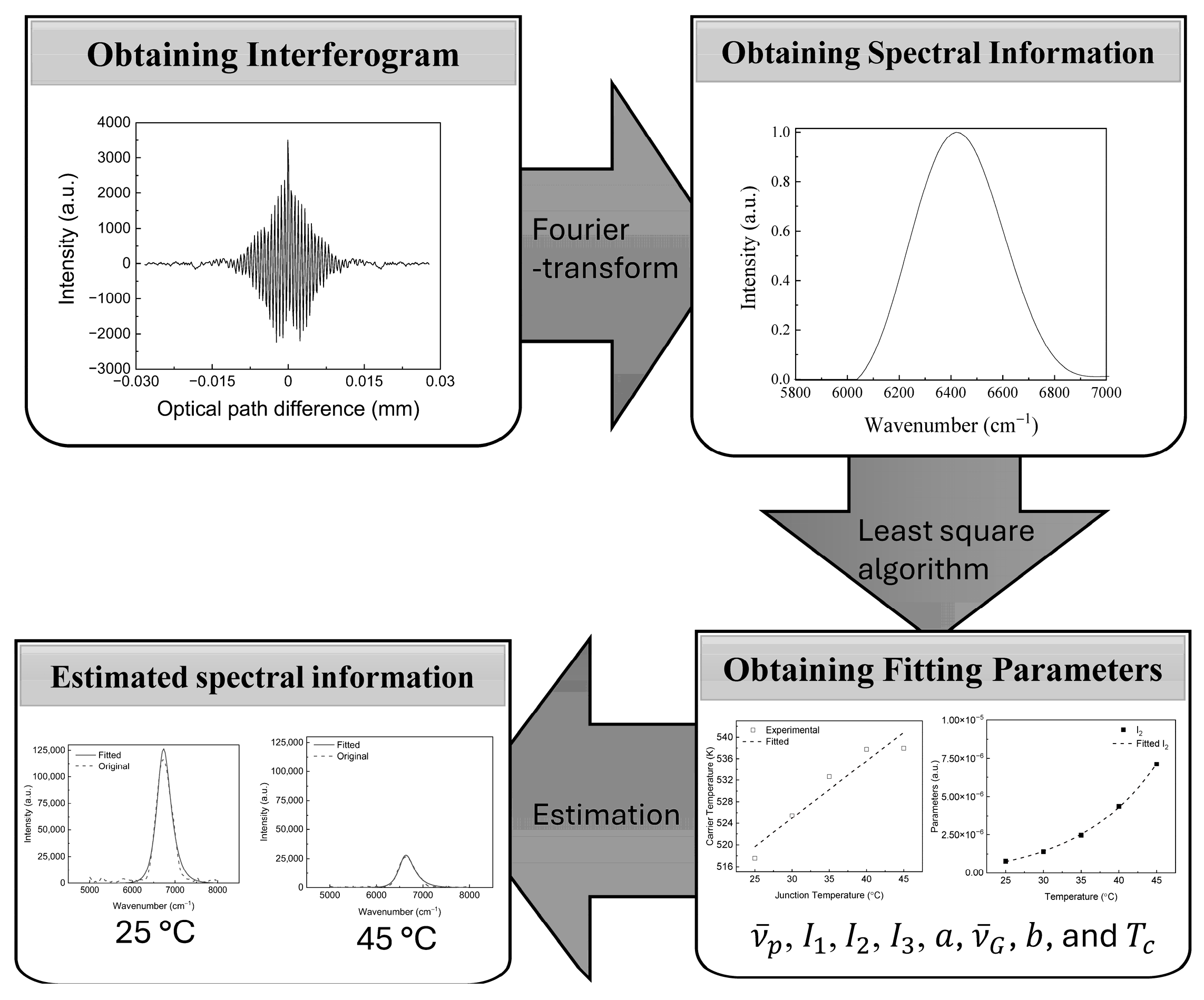 serves as a fitting parameter in the wavenumber domain. The advantage of this equation over Equation (1) is that the parameter values are significantly larger, which allows for more accurate estimation. Equation (3) is employed to extract parameters from the obtained spectral information using the least squares method. Specifically, information such as the peak wavenumber and junction temperature, along with the operating conditions of the optical source, can be obtained. These parameters are then used to estimate the emission spectrum. The concept of this procedure is depicted in