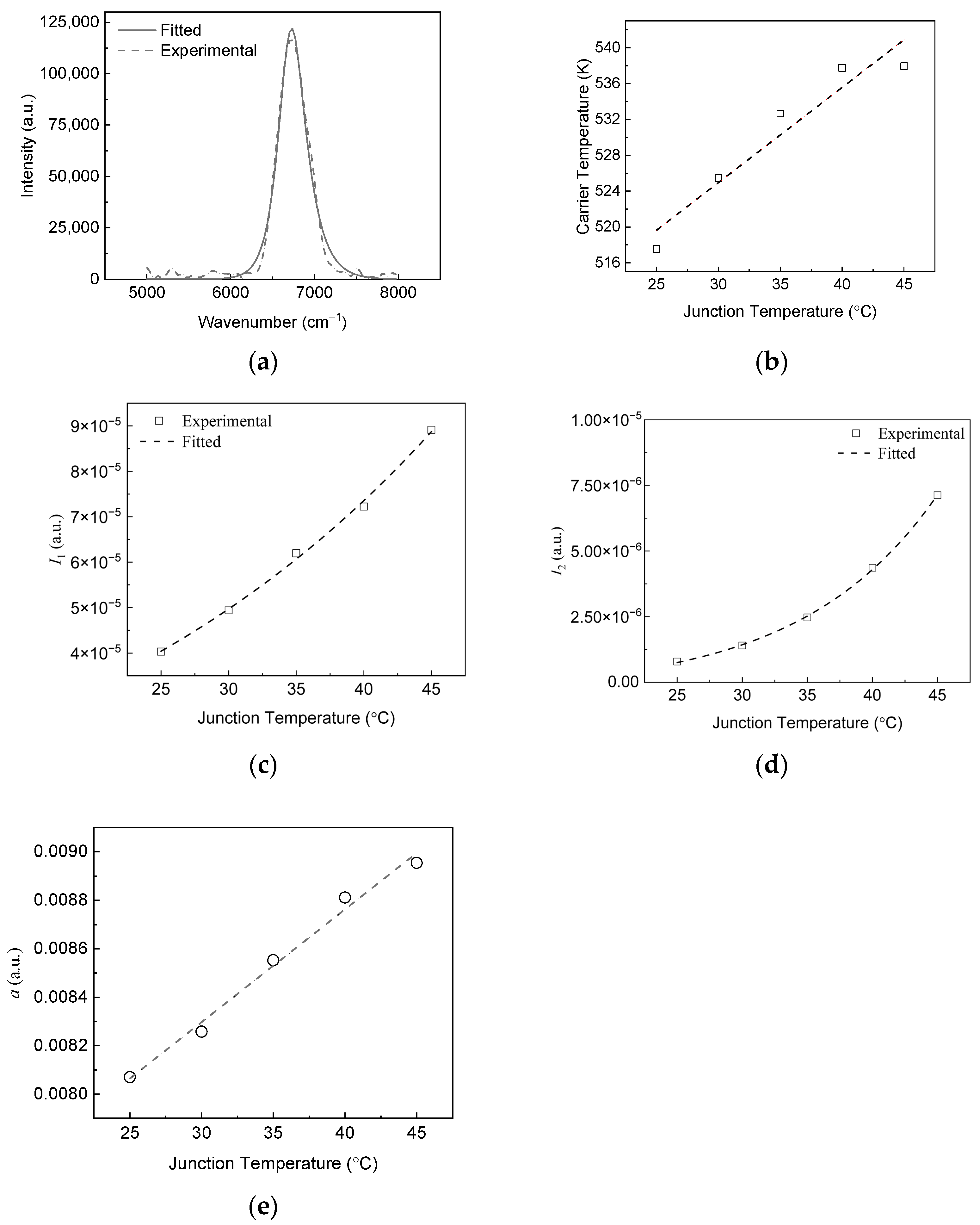 Figure 3b shows the carrier temperature as a function of the junction temperature. The carrier temperature increases from 244.4 °C to 264.8 °C, while the junction temperature increases from 25 °C to 45 °C. The relationship between the carrier temperature and the junction temperature is calculated using Equation (4), which is depicted by the dashed line. Fitting parameters representing the intensity of emission are investigated, as shown in