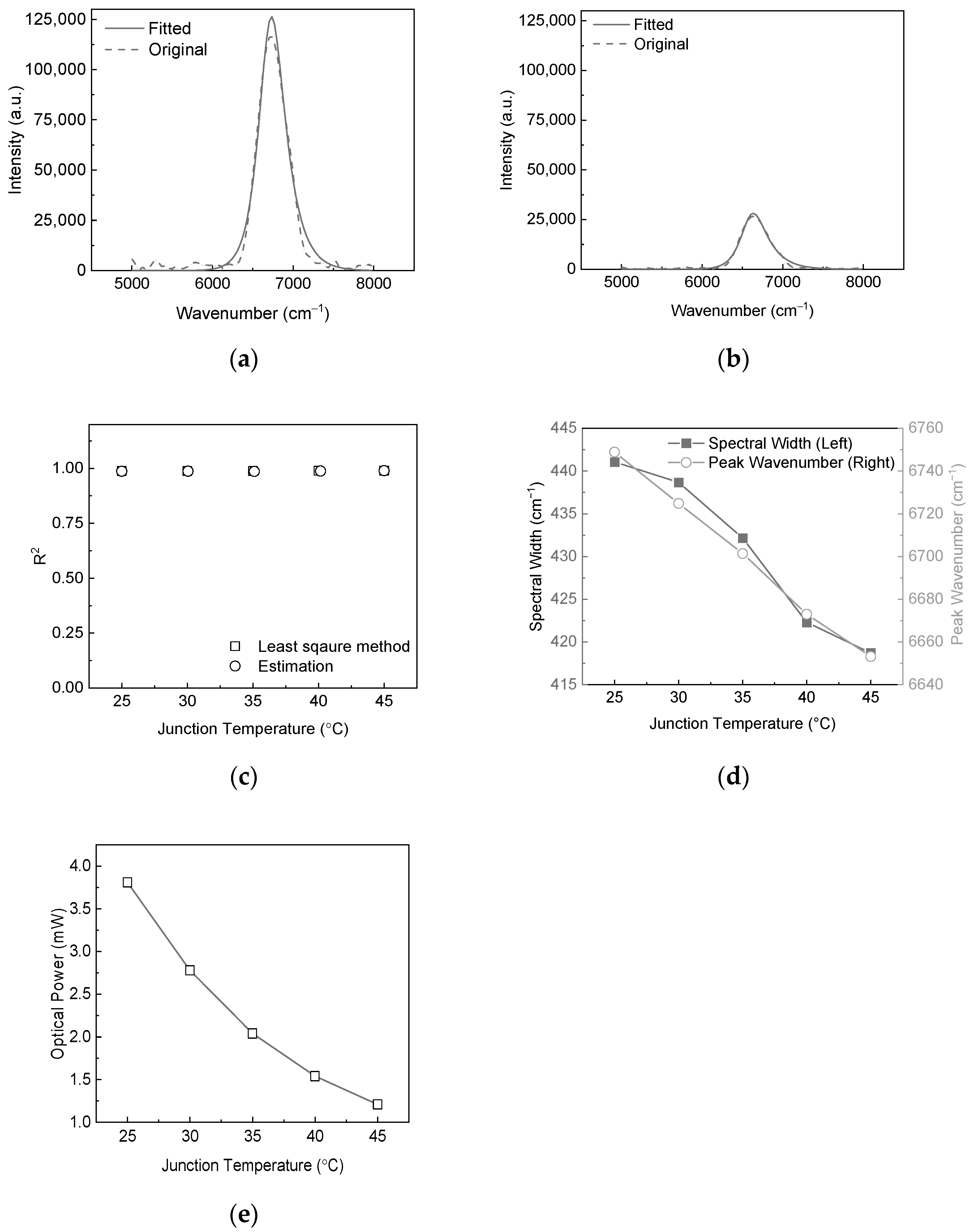 For this experiment, a source current was fixed at 0.55 A, and the junction temperature was varied from 25 °C to 45 °C in increments of 5 °C. A diode controller regulated the current and the temperature of the thermoelectric module attached to the substrate of the diode. During each measurement, no emission degradation was observed. Additionally, its emission was unpolarized. During the calculation, several parameters were held constant: = 1, = = 6422.11 cm−1, and = 0.1. When least squares method was applied to extract the parameters from the spectrum at a temperature of 25 °C, the results were = 4.031 × 10−5, = 7.884 × 10−7, = 0.008066, and =244.4 °C.