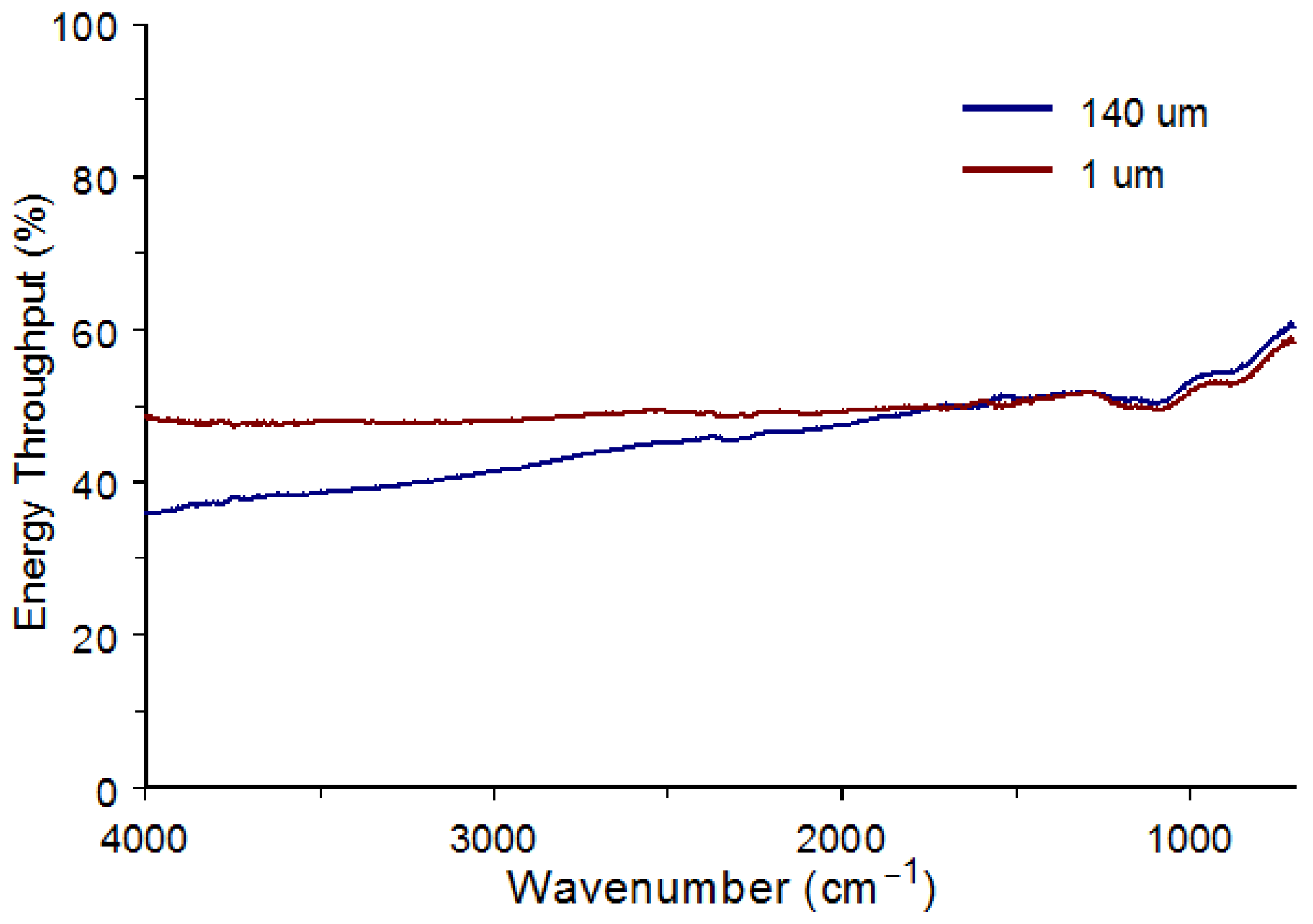 Figure 6 shows the energy throughput spectra for the diffuse reflection accessory when empty 1 µm (red) and 140 µm (blue) recessed mesh buttons were loaded, and button mesh orientations that provided the highest single-beam intensities were employed. The plots overlap below 1700 cm