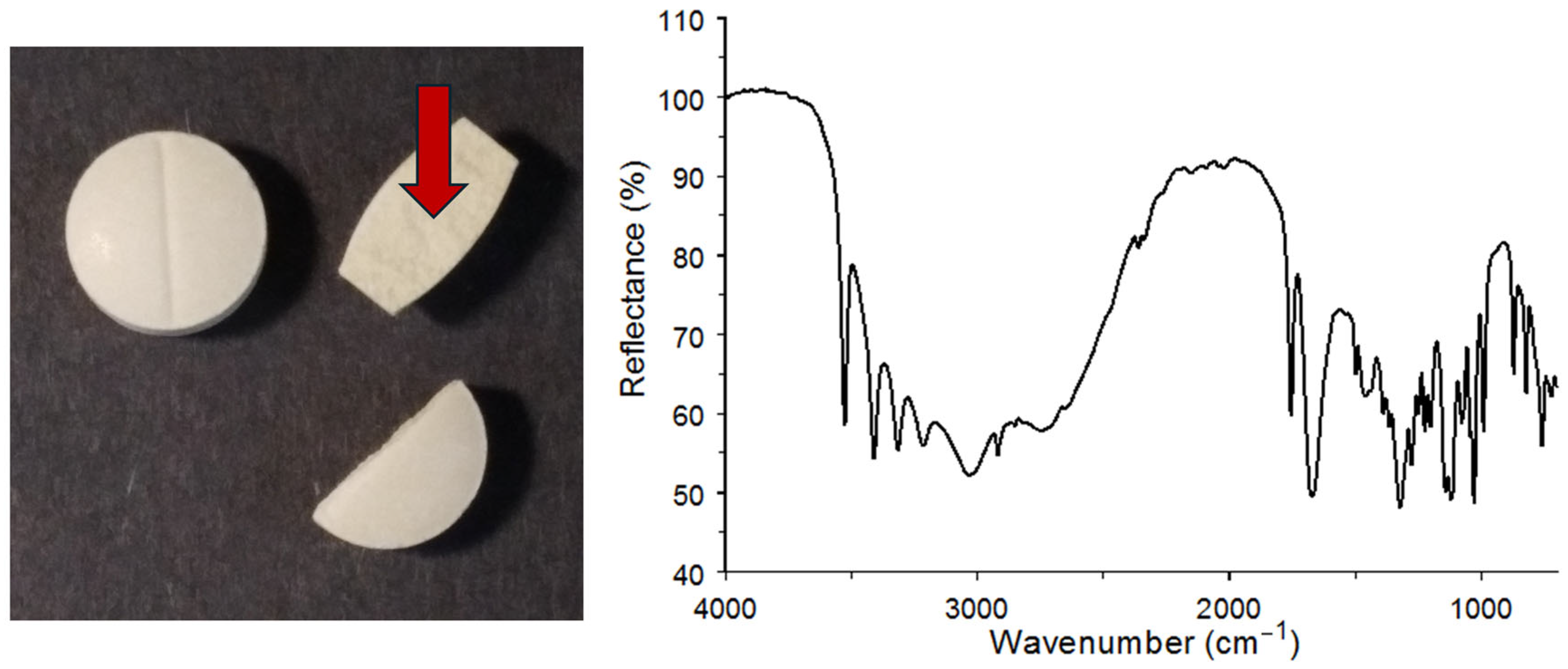 Figure 9 shows an infrared spectrum obtained by using this tool. A 500 mg vitamin C tablet was cut in half to expose the material inside. The tool was then used to transfer some of the exposed tablet material to the