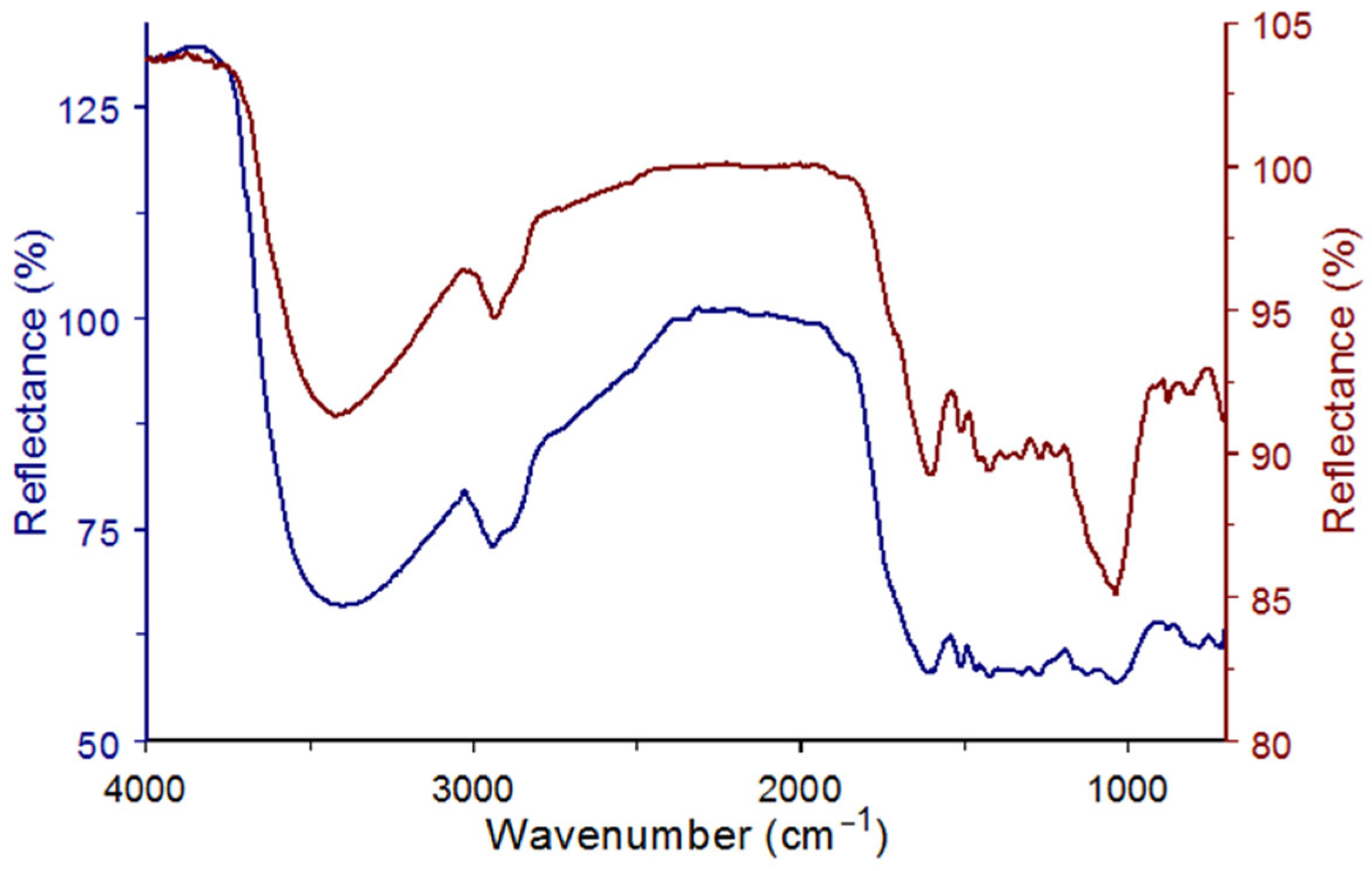 −1 indicate the presence of adsorbed water and solid material containing hydroxyl groups. Band intensities in the blue spectrum ranged from 55 to 128% reflectance (a 73% span), whereas the 19% red spectrum span extended from 85 to 104%. The larger wire diameters comprising the 140 µm mesh resulted in thicker sample layers and longer cumulative radiation penetration distances. Below 2000 cm