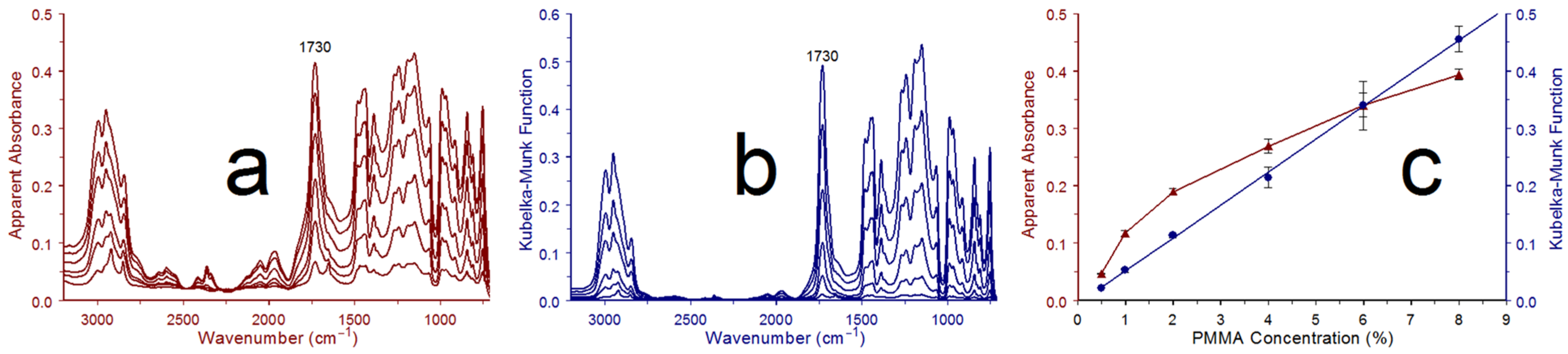 32] formats are commonly employed for diffuse reflection spectra. Averages of the three PMMA/KCl infrared spectra obtained for each standard mixture are shown in apparent absorbance and Kubelka–Munk formats in