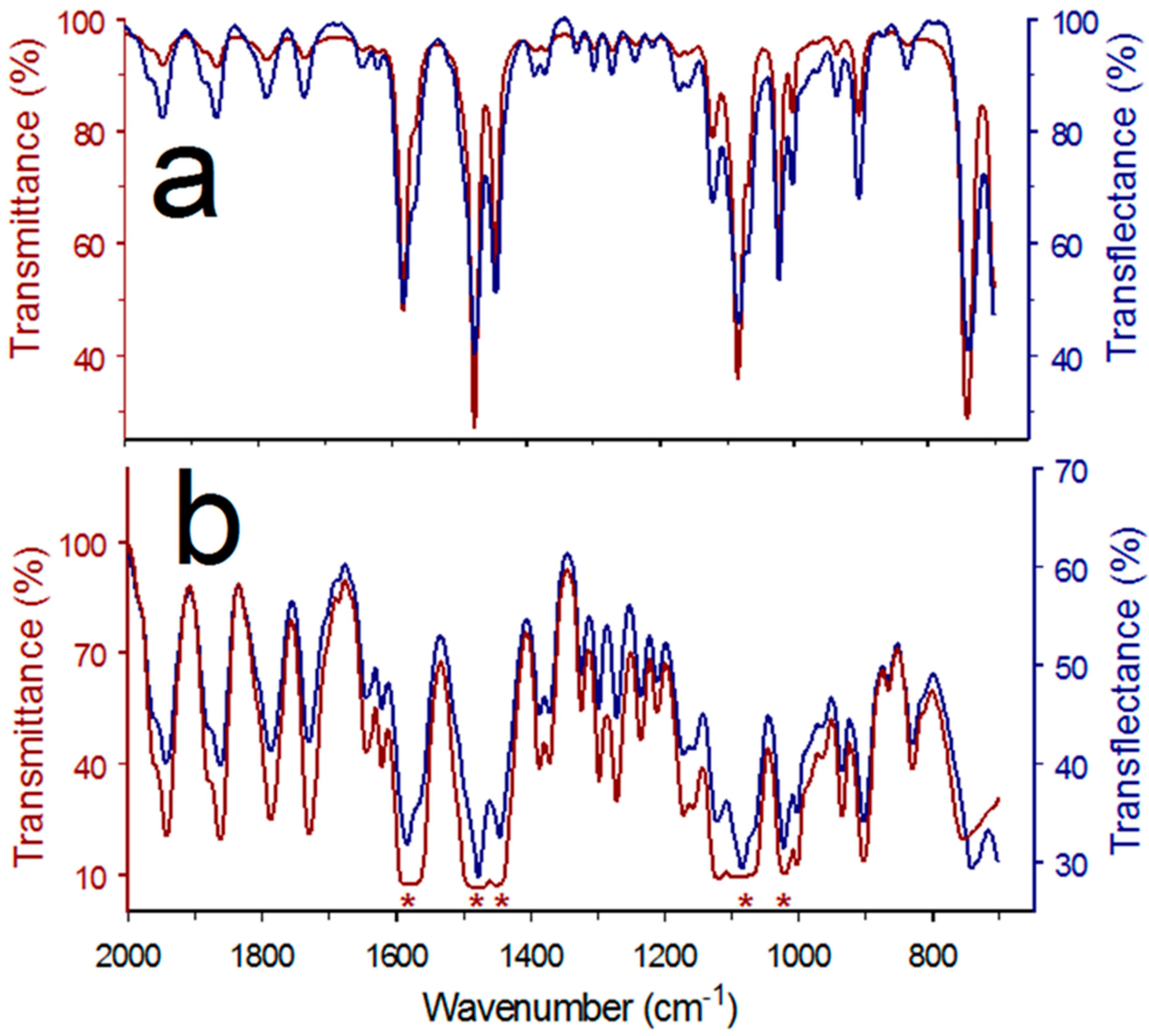 45]. The high surface tension of pure water resulted in a curvature of the fluid that caused a significant fraction of incident radiation to be reflected from the liquid surface, resulting in transflectance offsets from zero. At the same time, the flattened O-H stretching vibration band shapes indicated that some radiation penetrated deep into the pure water sample. The red plots in