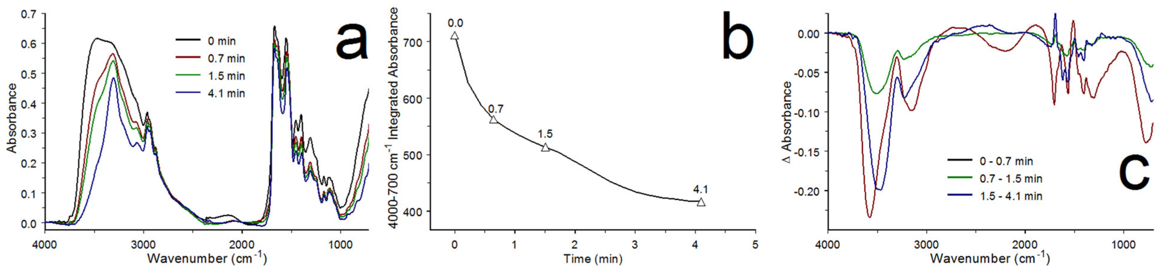 Figure 13b, after 4 min, most of the volatiles in the sample had evaporated, resulting in consistent infrared spectrum integrated areas. Interestingly, the initial integrated band area loss evident in this plot is not observed when ATR is employed for measurements. Instead, band intensities remain relatively constant until near the end of the evaporation process, and significant infrared spectrum changes are only detected when the last water molecules leave the sample [