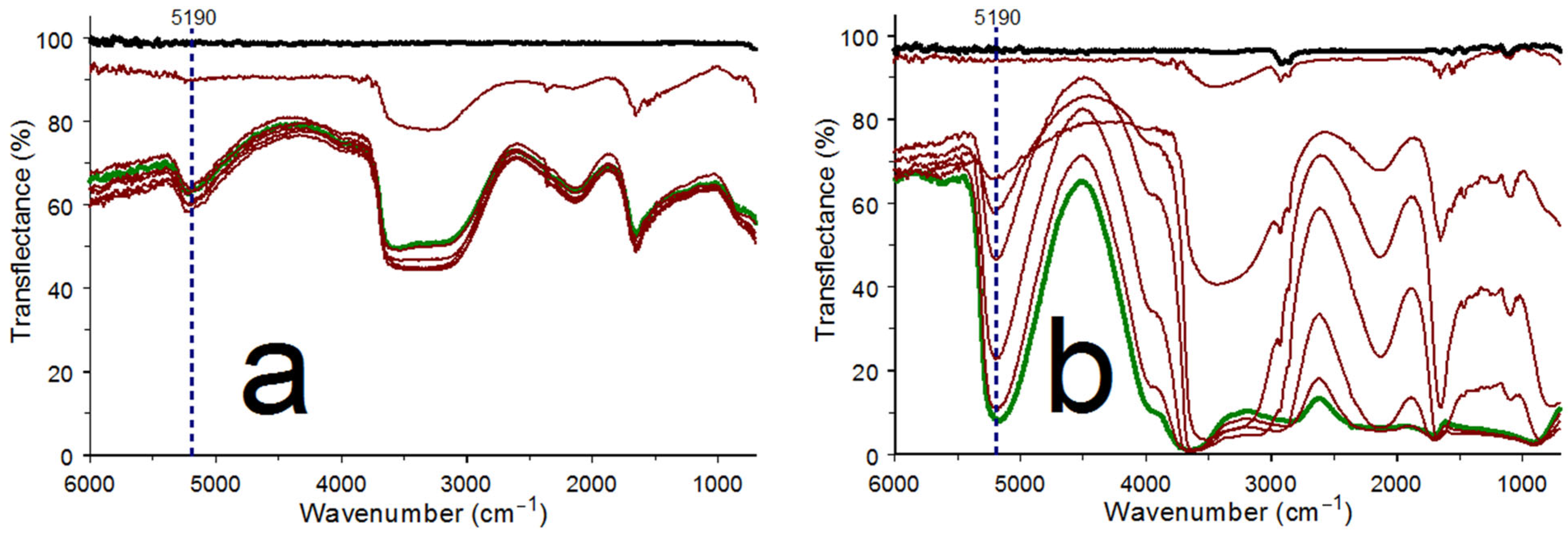 Figure 14 show the spectra obtained at about 1 min intervals during the first 7 min. The green plots denote spectra measured immediately after inserting the button into the diffuse reflection optics, and the black spectra were obtained after 7 min. The red spectra were obtained after the green and before the black spectrum acquisitions and reveal changes that occurred between 1 and 6 min. The water completely evaporated from both samples after 7 min. The bottoms of the pure water O-H stretching vibration bands at 3400 cm