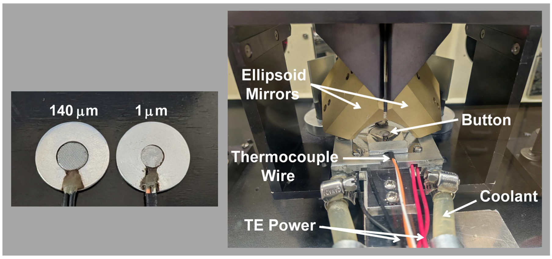 Figure 16. The left photo in the figure shows two buttons that contain thermocouples to facilitate temperature measurements. The thermocouples were spot-welded to the bottoms of thin wire mesh backings [
