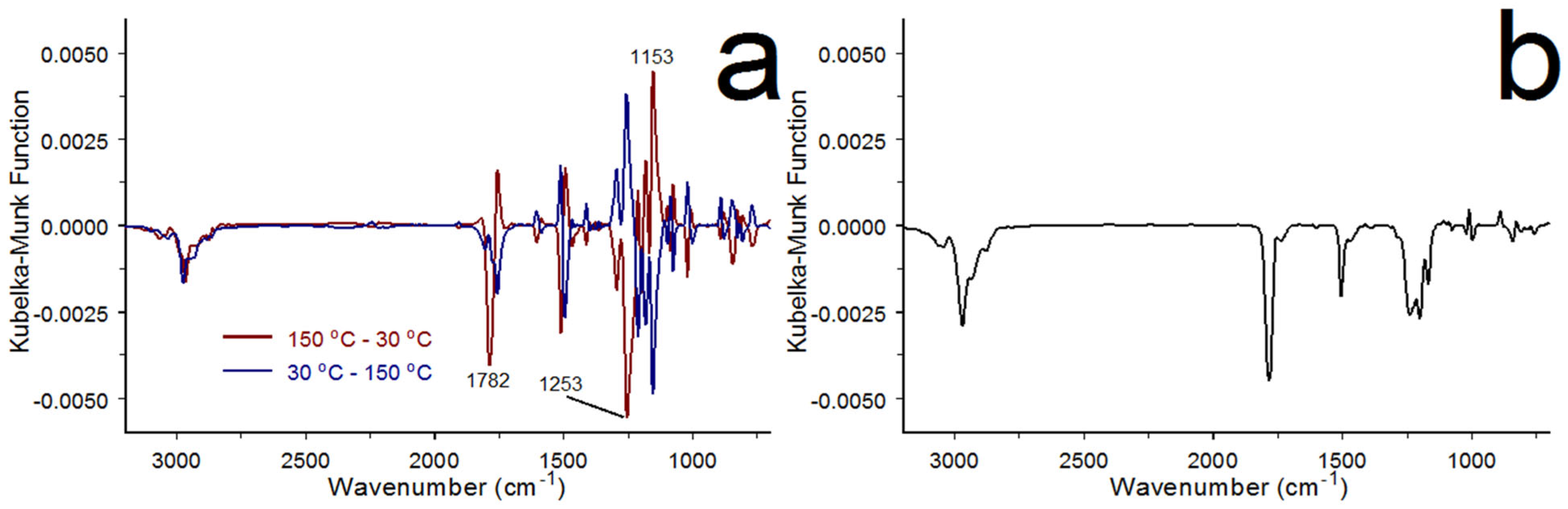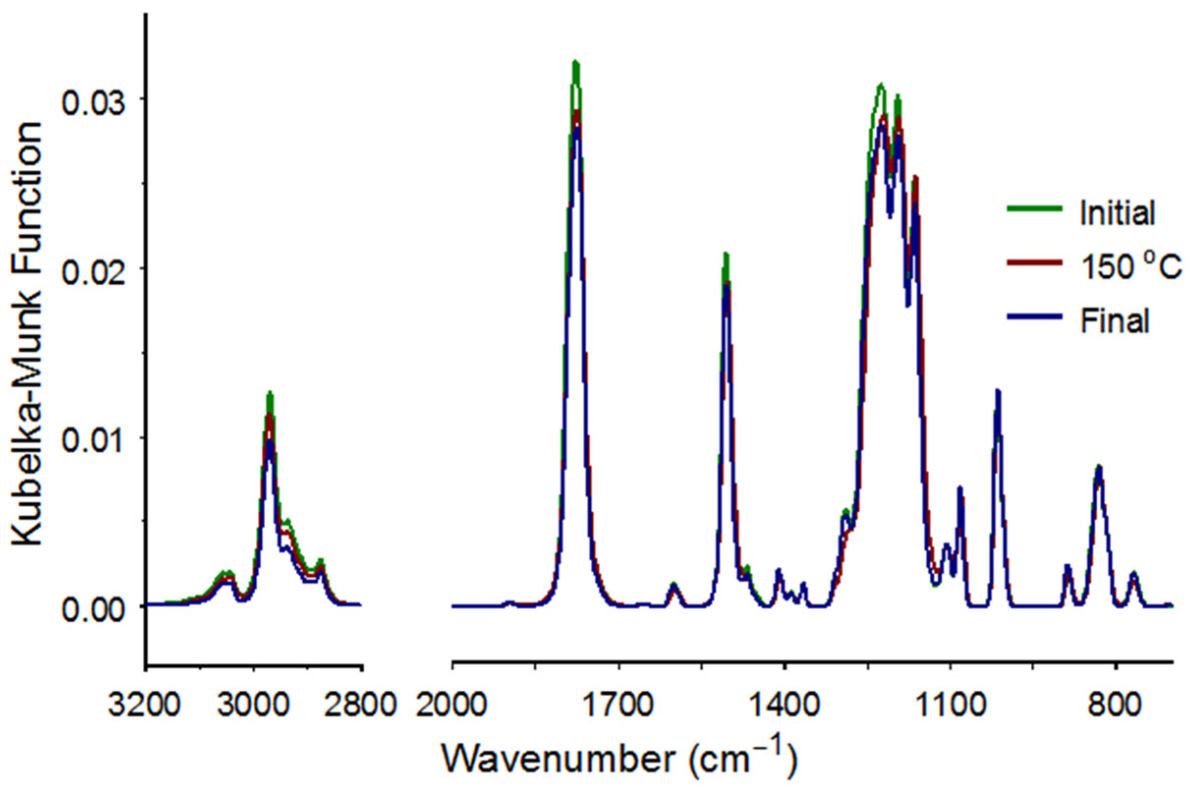 Figure 17 shows an overlay of the Kubelka–Munk format spectra obtained from the initial 30 °C (green), 150 °C (red), and the final 30 °C (blue) measurements. These plots are similar to previously published BPA-PC spectra [