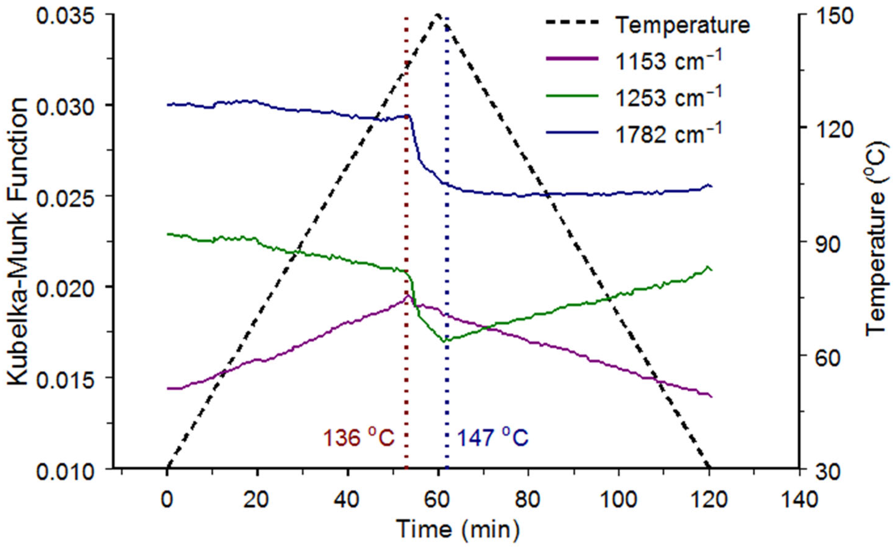 50]. This small temperature discrepancy may be attributed to different polymer compositions, particularly in the amounts and types of additives and/or analysis method differences. More information regarding the temperature-dependent properties of this polymer may be obtained by examining intensity versus temperature trends for other functional groups and by tracking band maximum wavenumber shifts. The reversible and irreversible sample changes may be characterized further by applying temperature step heating/cooling profiles to the material [