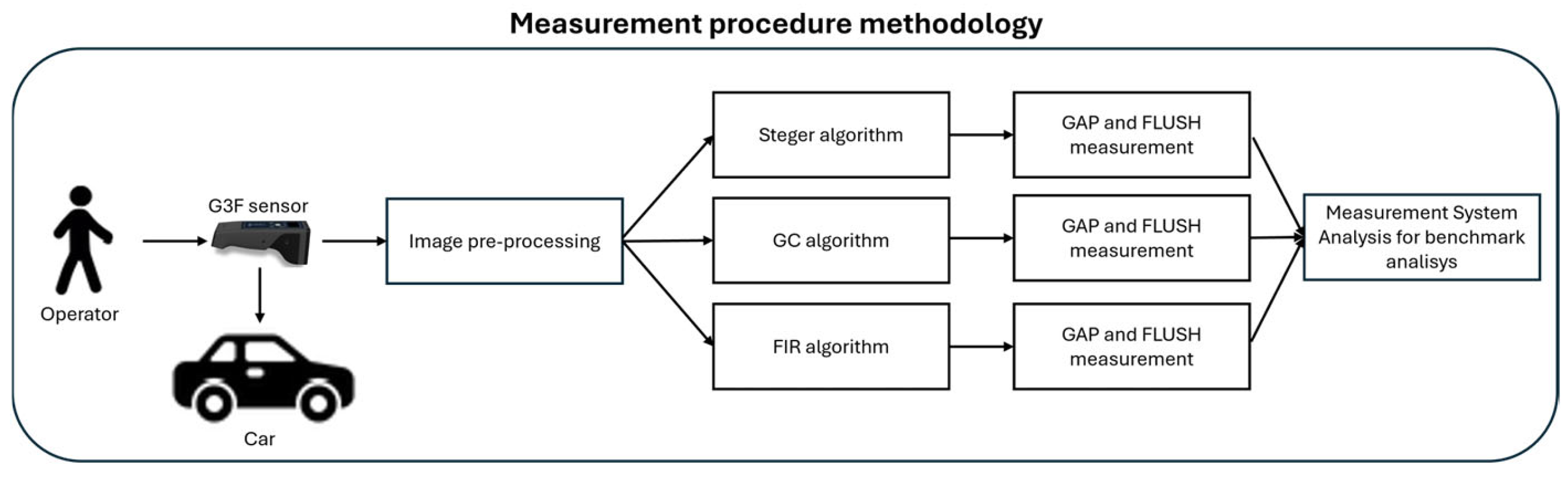 16], and introduces a novel contribution: a comparative analysis of three dedicated algorithms for gap and flush measurement. The key innovation of this work lies in evaluating these algorithms through a rigorous Measurement System Analysis (MSA), which systematically assesses their accuracy, repeatability, and reproducibility under varying operational conditions. While the G3F system itself is already established, this study provides new insights into the relative performance of the algorithms, highlighting how differences in mathematical modelling, signal processing strategies, and sensitivity to environmental factors affect measurement reliability. This MSA-based comparison offers a robust framework for benchmarking laser-based gap and flush measurement techniques in real-world automotive scenarios.